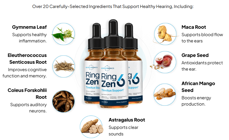 RingZen6 is a natural supplement formulated to reduce ear ringing (tinnitus) and support hearing and brain health. It blends antioxidants, amino acids, and botanical extracts that promote cellular repair and enhance communication between the ear and brain.